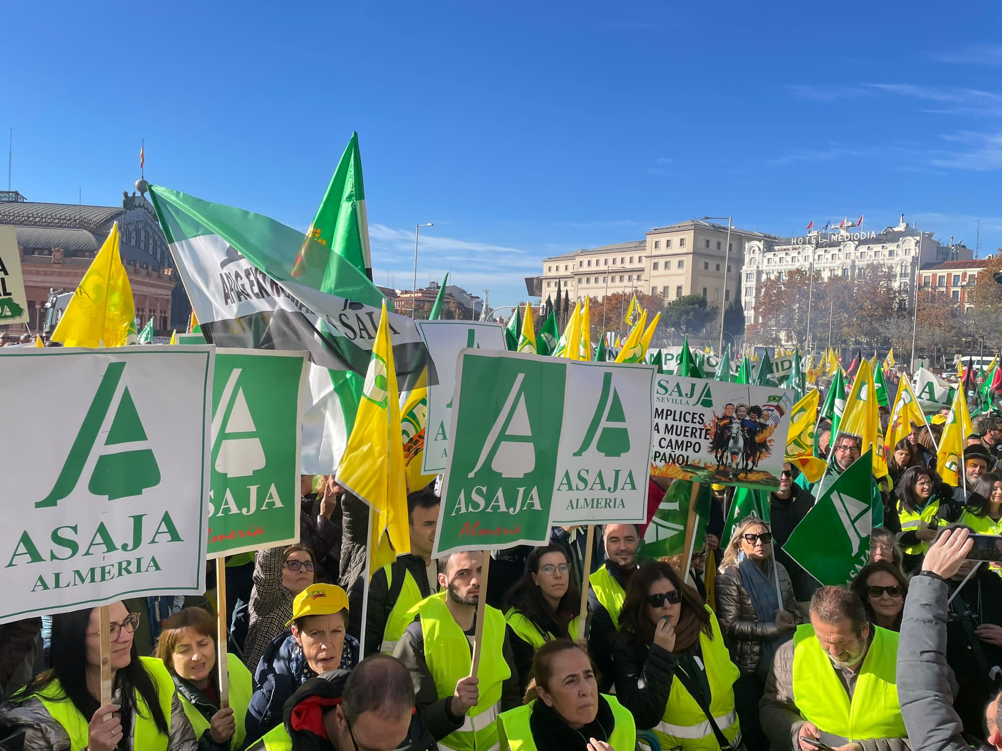 Varios miles de agricultores (5.000 según las organizaciones convocantes y algo más de un millar según la Delegación del Gobierno) se han concentrado este lunes ante la sede del Ministerio de Agricultura, Pesca y Alimentación (MAPA) en Madrid. La protesta, convocada por las organizaciones agrarias ASAJA y COAG y con el apoyo de Cooperativas Agroalimentarias de España, busca denunciar los efectos negativos de los acuerdos de libre comercio, especialmente el reciente pacto entre la Unión Europea y Mercosur, que consideran una amenaza directa para su actividad.